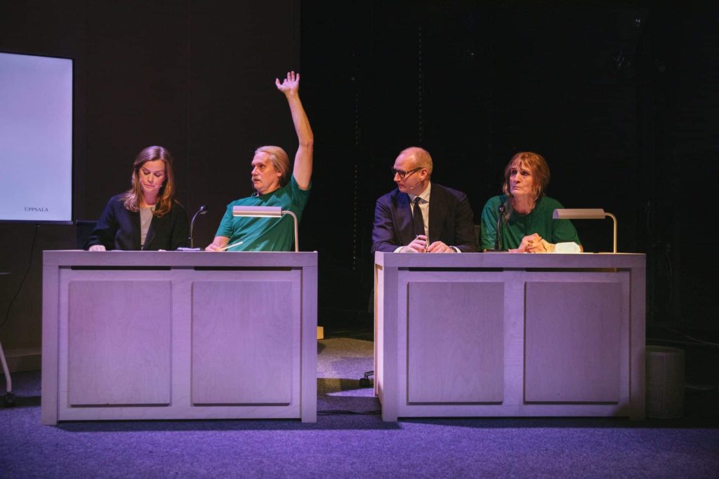 Huvudförhandlingen i Uppsala stadsteaters domstolspjäs med Sofia Hansson, Jakob Fahlstedt, Kronje Samuelsson och Lolo Elwin. Foto: Julia Mård